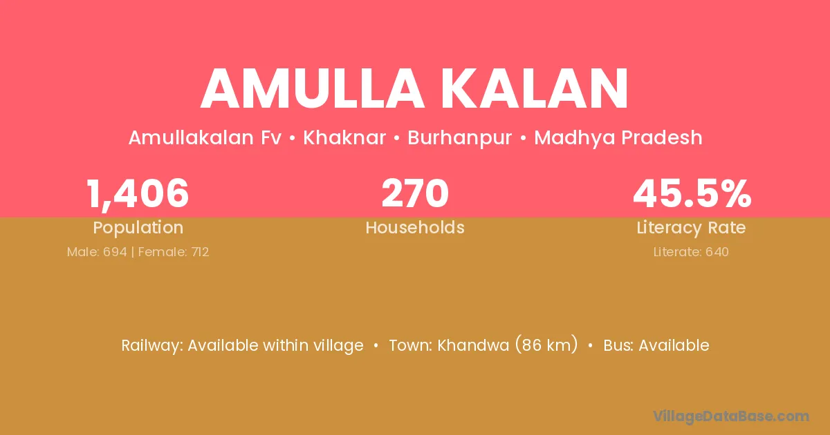 Khandwa (86 km) is the nearest town to Amulla Kalan village for major economic activities and is located approximately 86 km away.