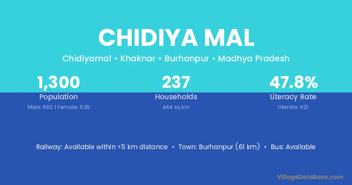 Burhanpur (61 km) is the nearest town to Chidiya Mal village for major economic activities and is located approximately 61 km away.