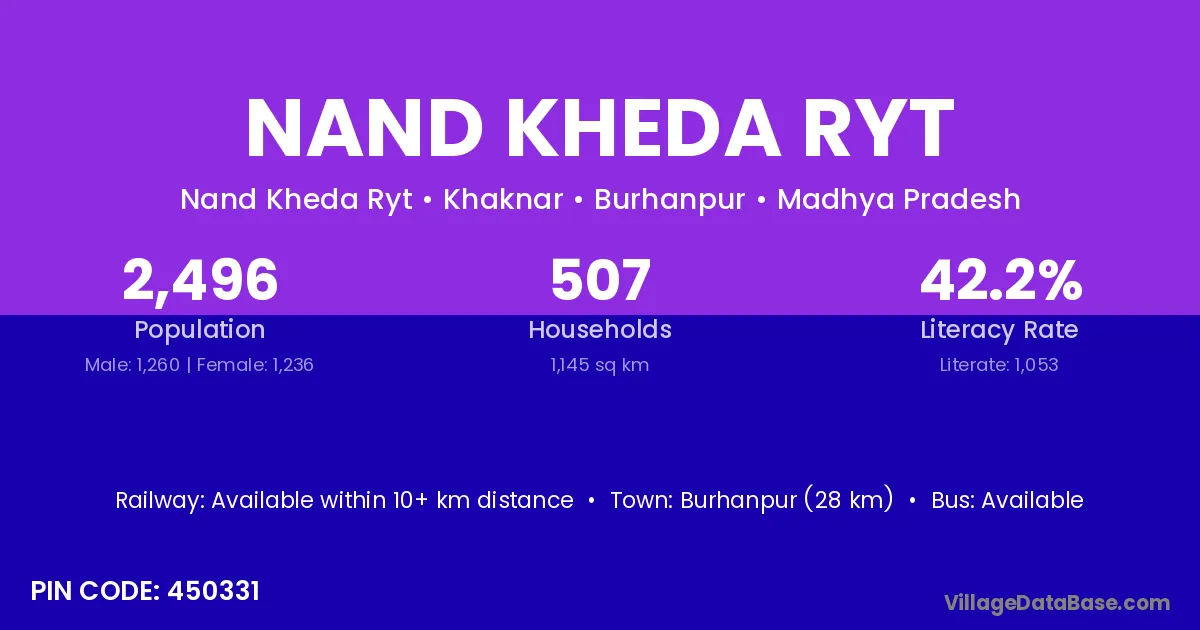 Burhanpur (28 km) is the nearest town to Nand Kheda Ryt village for major economic activities and is located approximately 28 km away.