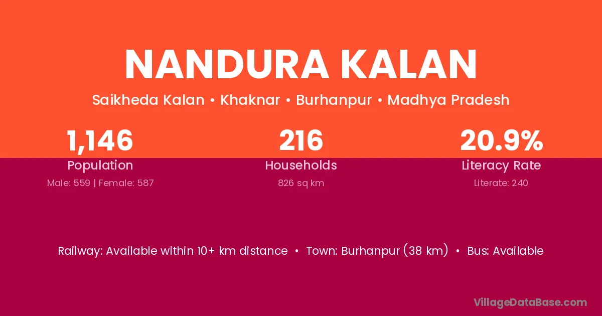 Burhanpur (38 km) is the nearest town to Nandura Kalan village for major economic activities and is located approximately 38 km away.