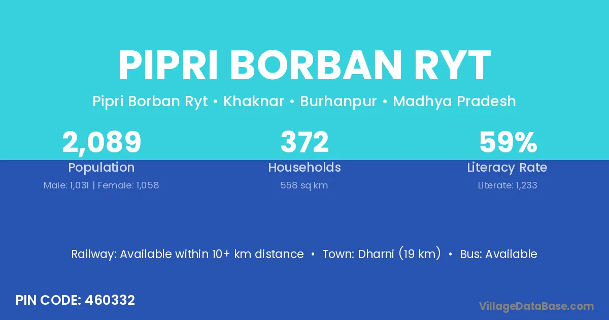 Dharni (19 km) is the nearest town to Pipri Borban Ryt village for major economic activities and is located approximately 19 km away.