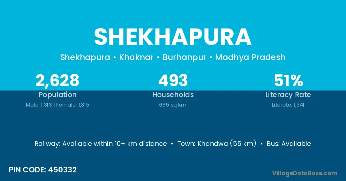 Khandwa (55 km) is the nearest town to Shekhapura village for major economic activities and is located approximately 55 km away.