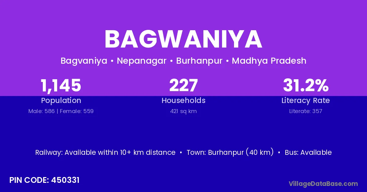 Burhanpur (40 km) is the nearest town to Bagwaniya village for major economic activities and is located approximately 40 km away.