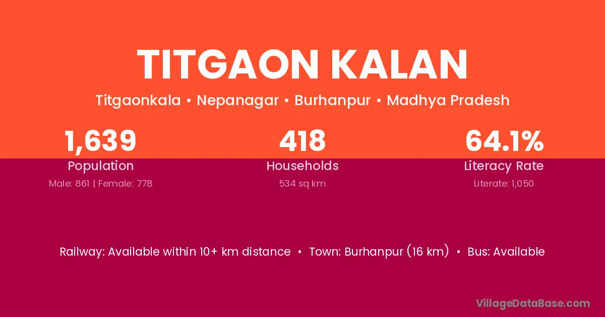 Burhanpur (16 km) is the nearest town to Titgaon Kalan village for major economic activities and is located approximately 16 km away.