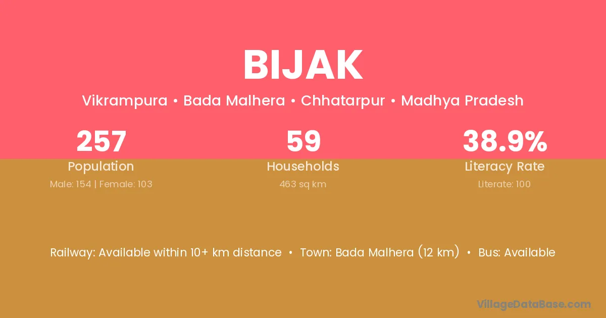 Bada Malhera (12 km) is the nearest town to Bijak village for major economic activities and is located approximately 12 km away.
