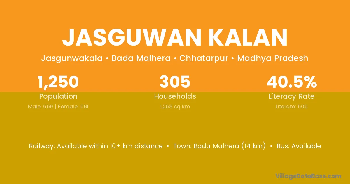 Bada Malhera (14 km) is the nearest town to Jasguwan Kalan village for major economic activities and is located approximately 14 km away.