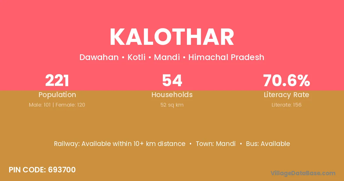 The literacy rate of Kalothar village is 47.83%. Male literacy stands at 58.62% and female literacy at 35.14%.