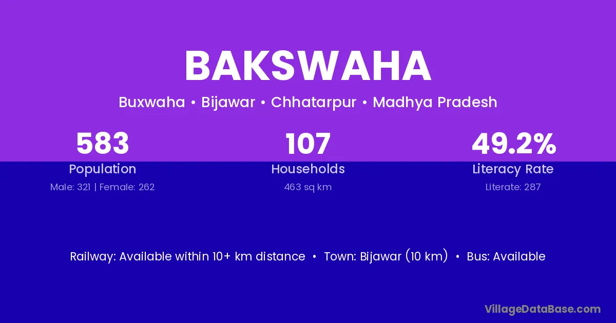 Bijawar (10 km) is the nearest town to Bakswaha village for major economic activities and is located approximately 10 km away.