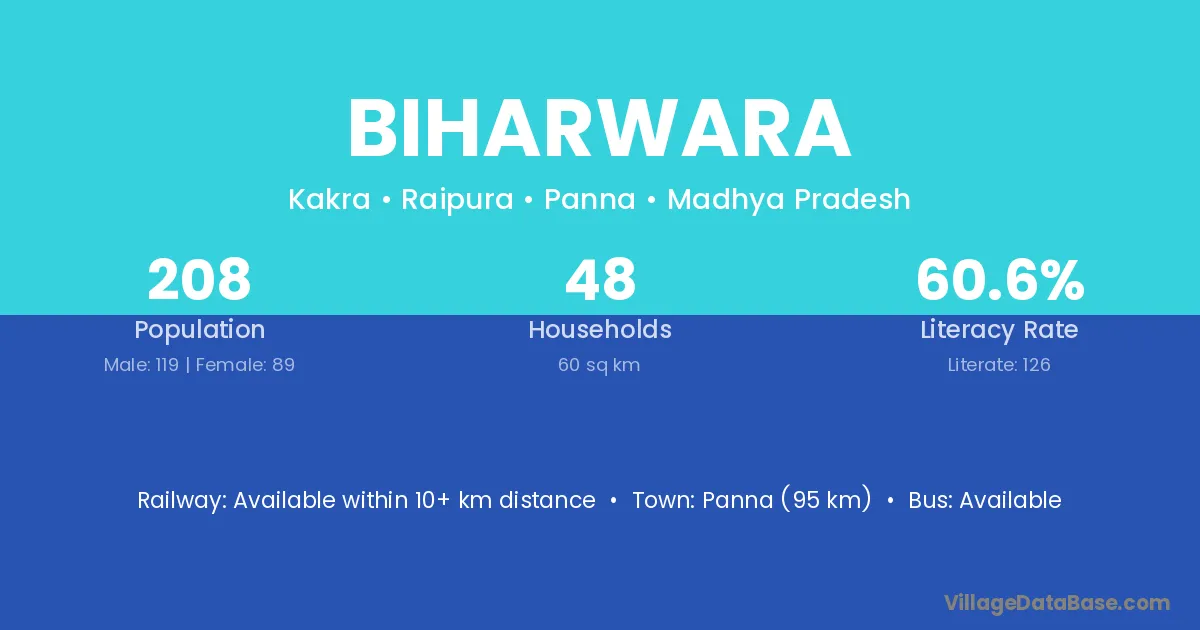 Bijawar (48 km) is the nearest town to Biharwara village for major economic activities and is located approximately 48 km away.