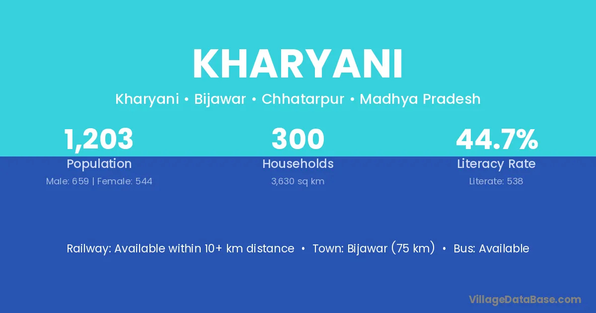 Bijawar (75 km) is the nearest town to Kharyani village for major economic activities and is located approximately 75 km away.