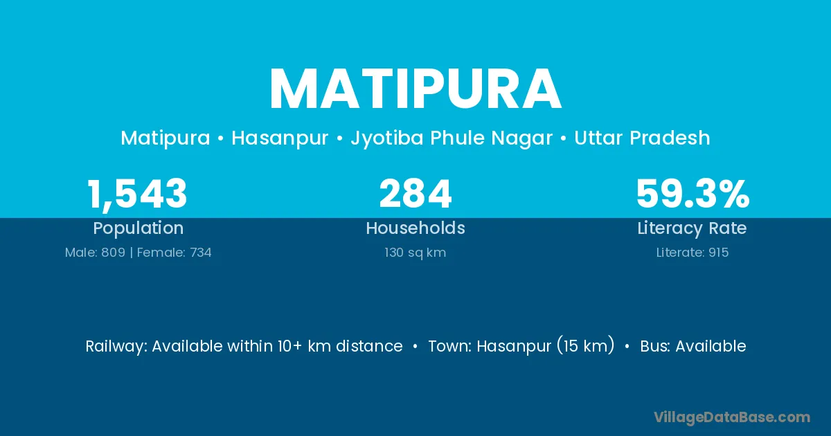 The literacy rate of Matipura village is 19.30%. Male literacy stands at 18.60% and female literacy at 20.07%.