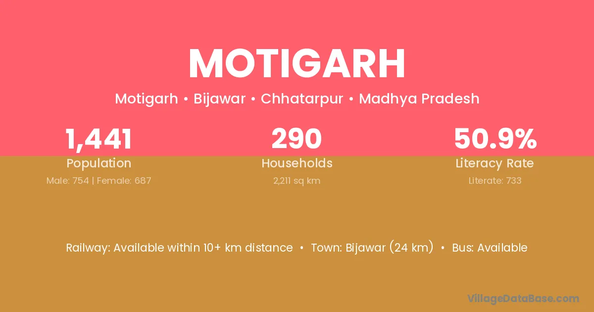 Bijawar (24 km) is the nearest town to Motigarh village for major economic activities and is located approximately 24 km away.