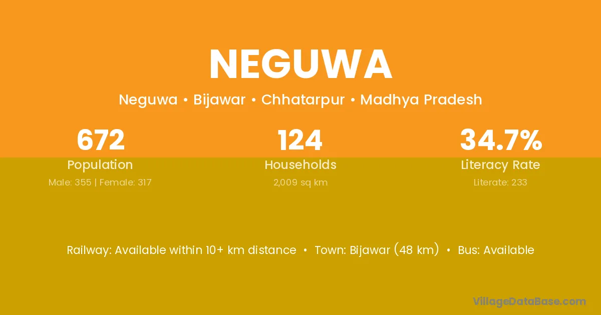 Bijawar (48 km) is the nearest town to Neguwa village for major economic activities and is located approximately 48 km away.