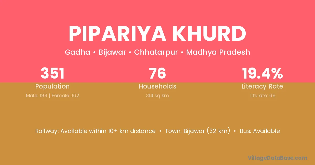Bijawar (32 km) is the nearest town to Pipariya Khurd village for major economic activities and is located approximately 32 km away.
