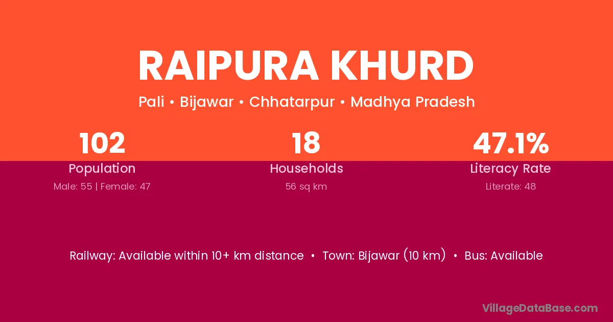 Bijawar (10 km) is the nearest town to Raipura Khurd village for major economic activities and is located approximately 10 km away.