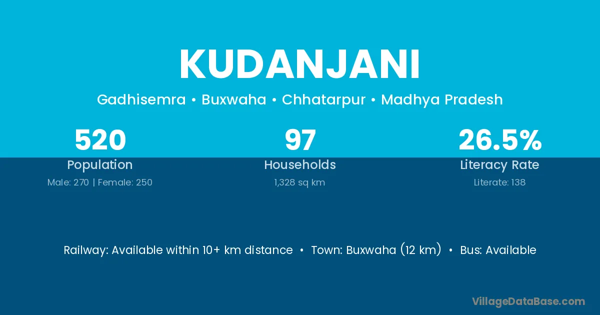 Buxwaha (12 km) is the nearest town to Kudanjani village for major economic activities and is located approximately 12 km away.