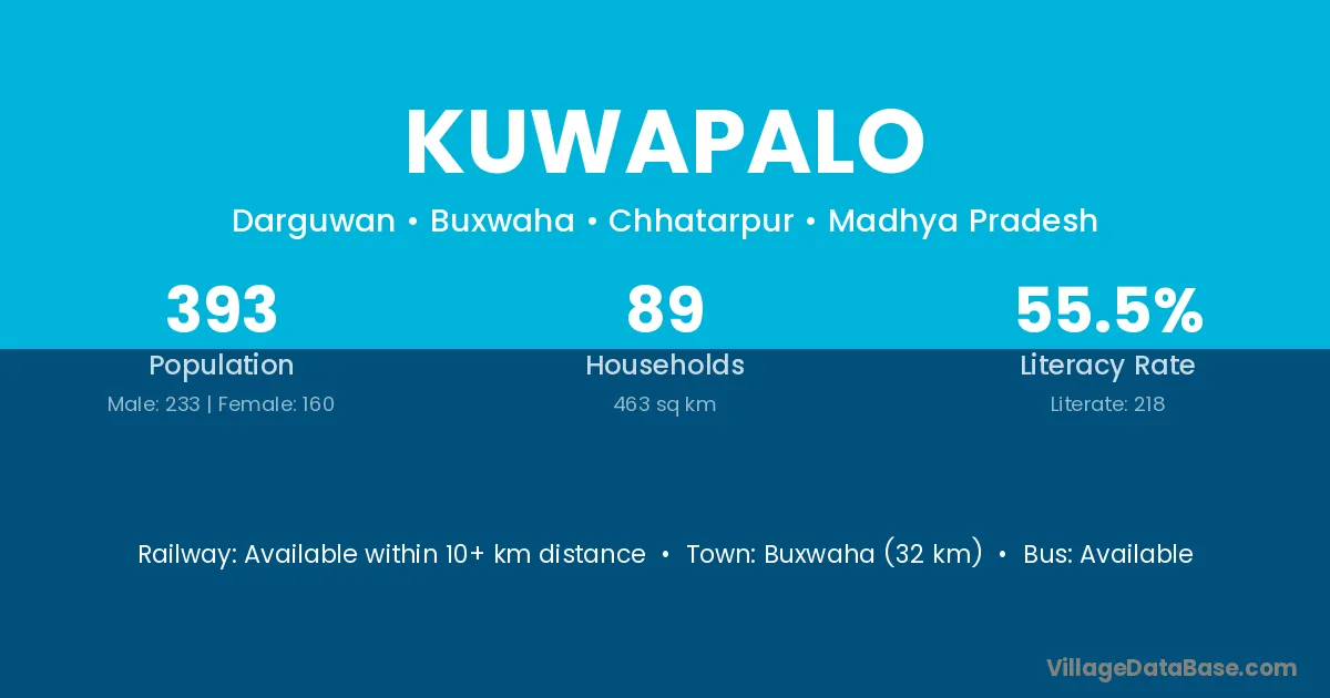 Buxwaha (32 km) is the nearest town to Kuwapalo village for major economic activities and is located approximately 32 km away.