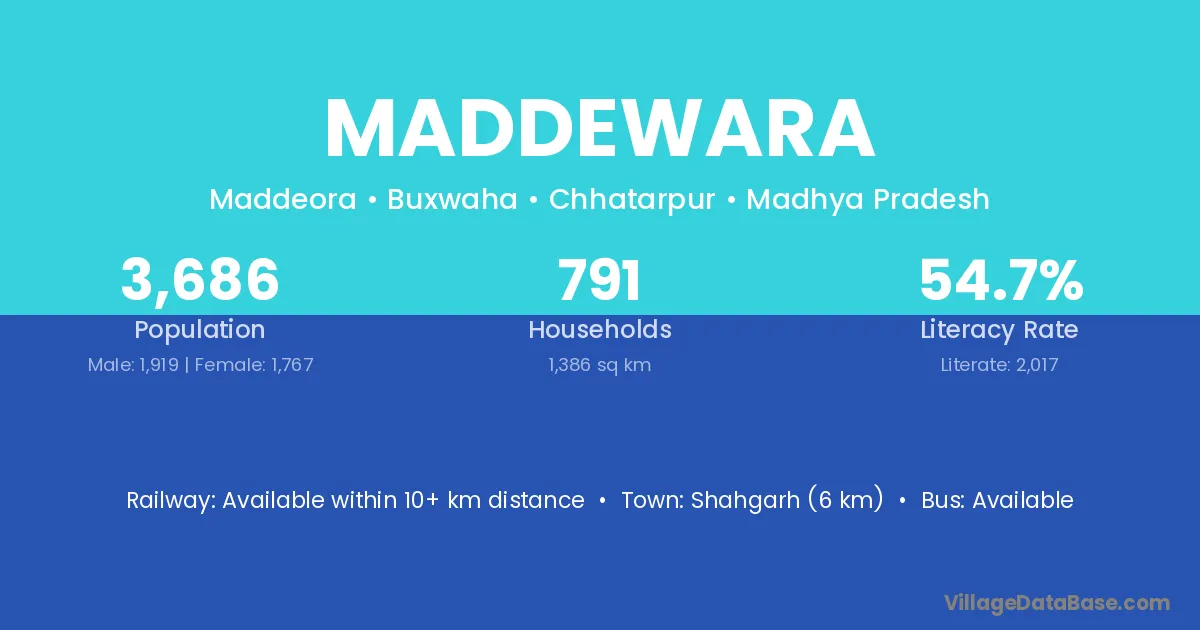 Shahgarh (6 km) is the nearest town to Maddewara village for major economic activities and is located approximately 6 km away.
