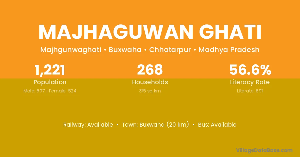 Buxwaha (20 km) is the nearest town to Majhaguwan Ghati village for major economic activities and is located approximately 20 km away.