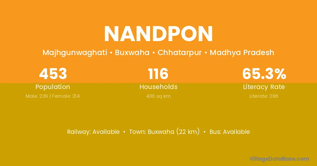 Buxwaha (22 km) is the nearest town to Nandpon village for major economic activities and is located approximately 22 km away.