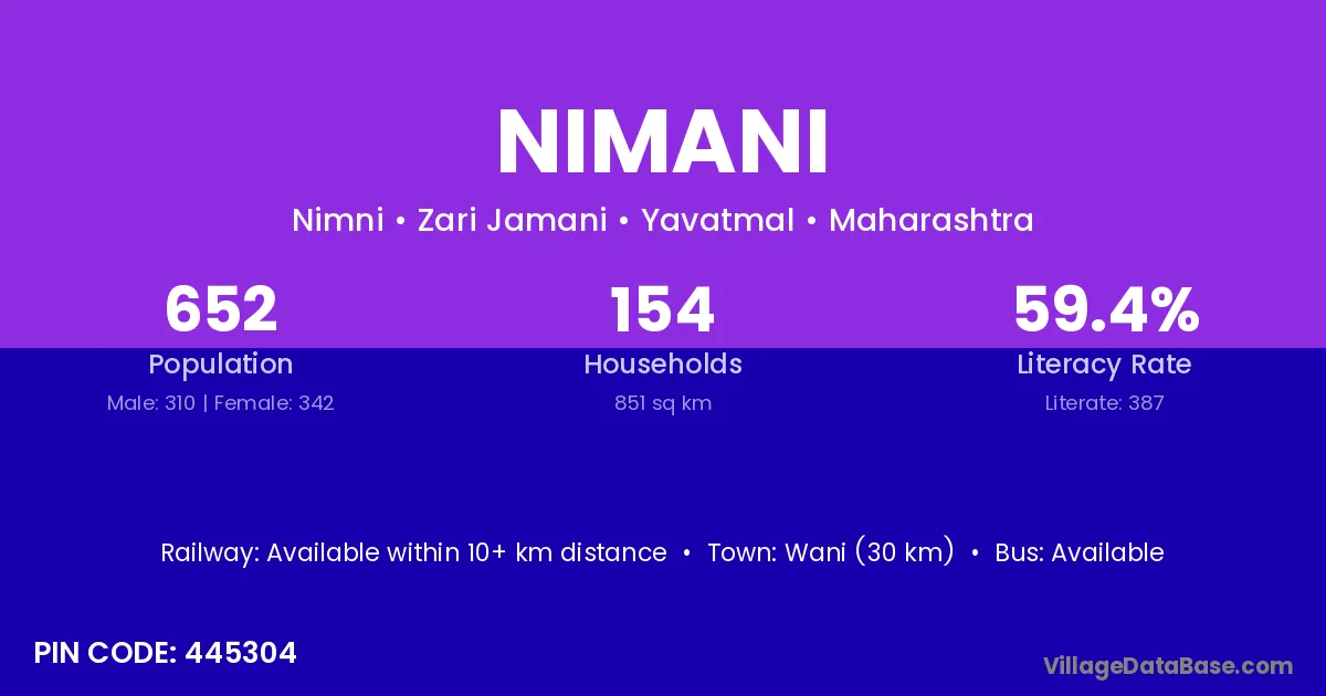 Buxwaha (14 km) is the nearest town to Nimani village for major economic activities and is located approximately 14 km away.