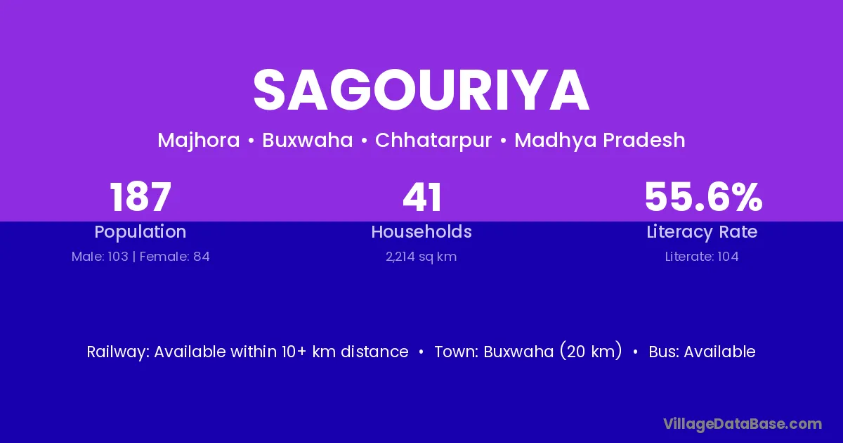 Buxwaha (20 km) is the nearest town to Sagouriya village for major economic activities and is located approximately 20 km away.