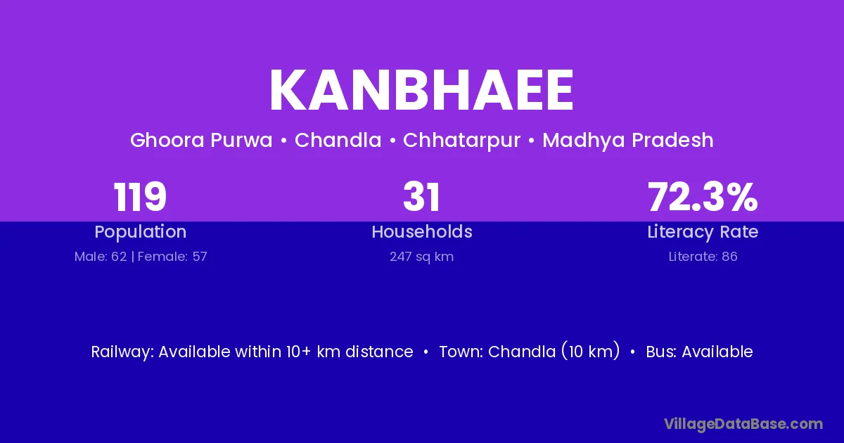 Kanbhaee village has a total population of 119 people, of which 62 are males and 57 are females.