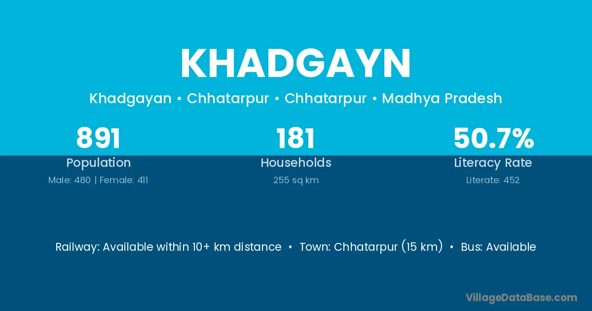 Chhatarpur (15 km) is the nearest town to Khadgayn village for major economic activities and is located approximately 15 km away.