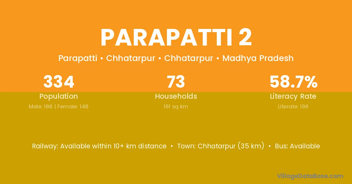 Chhatarpur (35 km) is the nearest town to Parapatti 2 village for major economic activities and is located approximately 35 km away.