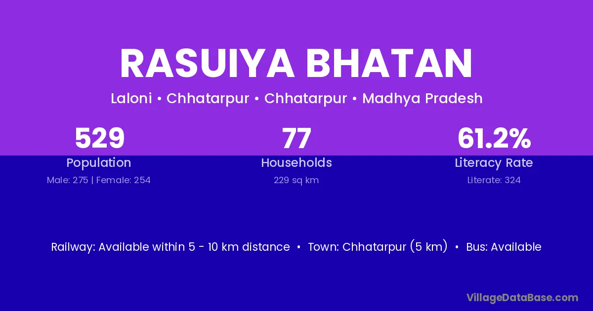Chhatarpur (5 km) is the nearest town to Rasuiya Bhatan village for major economic activities and is located approximately 5 km away.