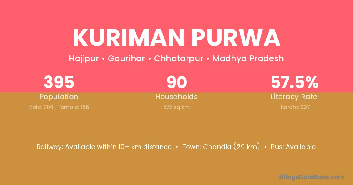 Kuriman Purwa village has a total population of 395 people, of which 209 are males and 186 are females.