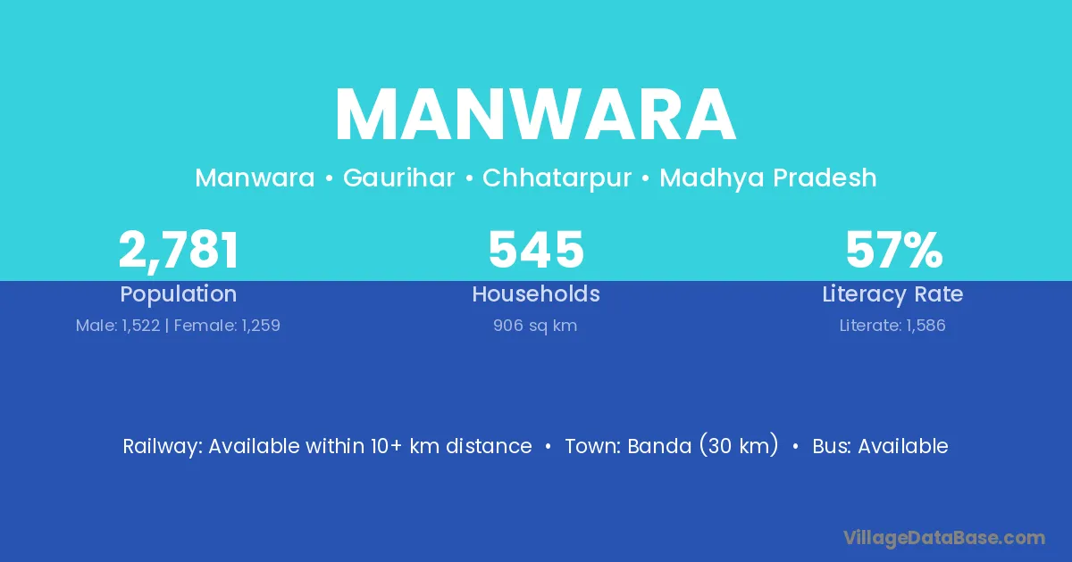Banda (30 km) is the nearest town to Manwara village for major economic activities and is located approximately 30 km away.