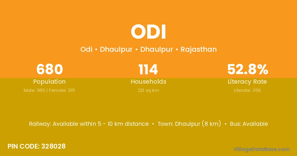 The literacy rate of Odi village is 61.69%. Male literacy stands at 72.01% and female literacy at 50.21%.