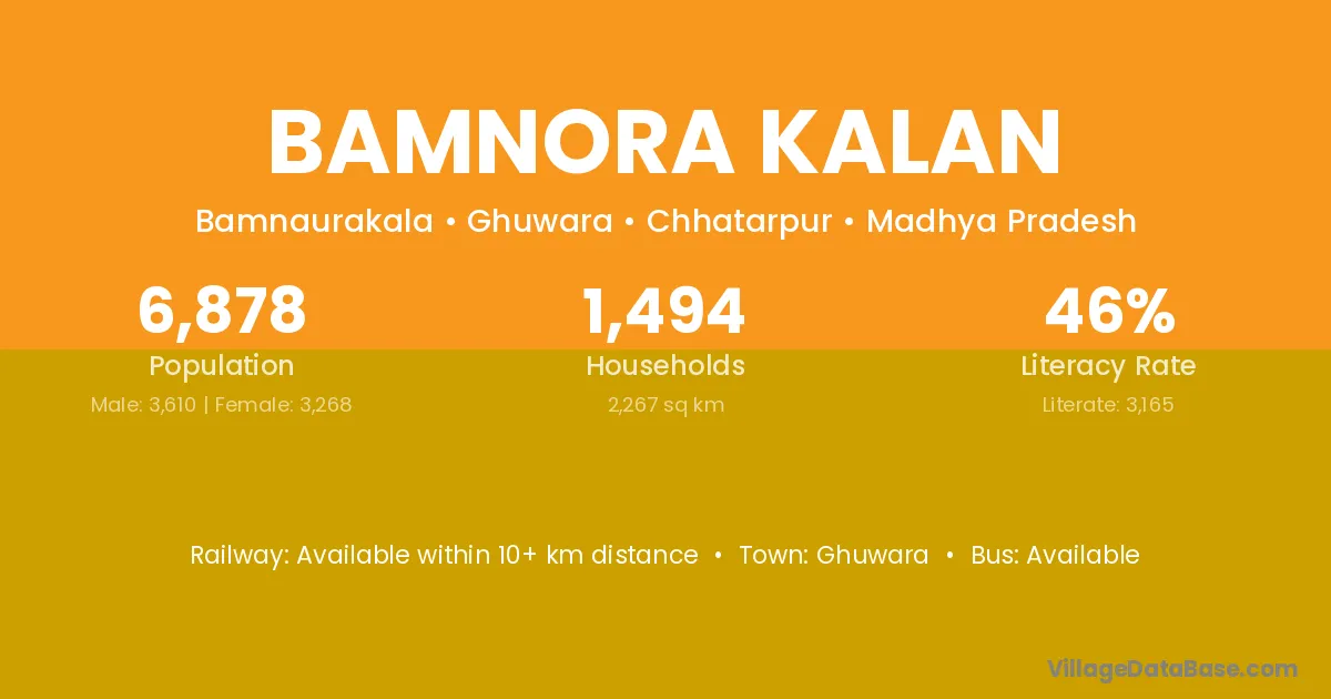 Bamnora Kalan village has a total population of 6,878 people, of which 3,610 are males and 3,268 are females.