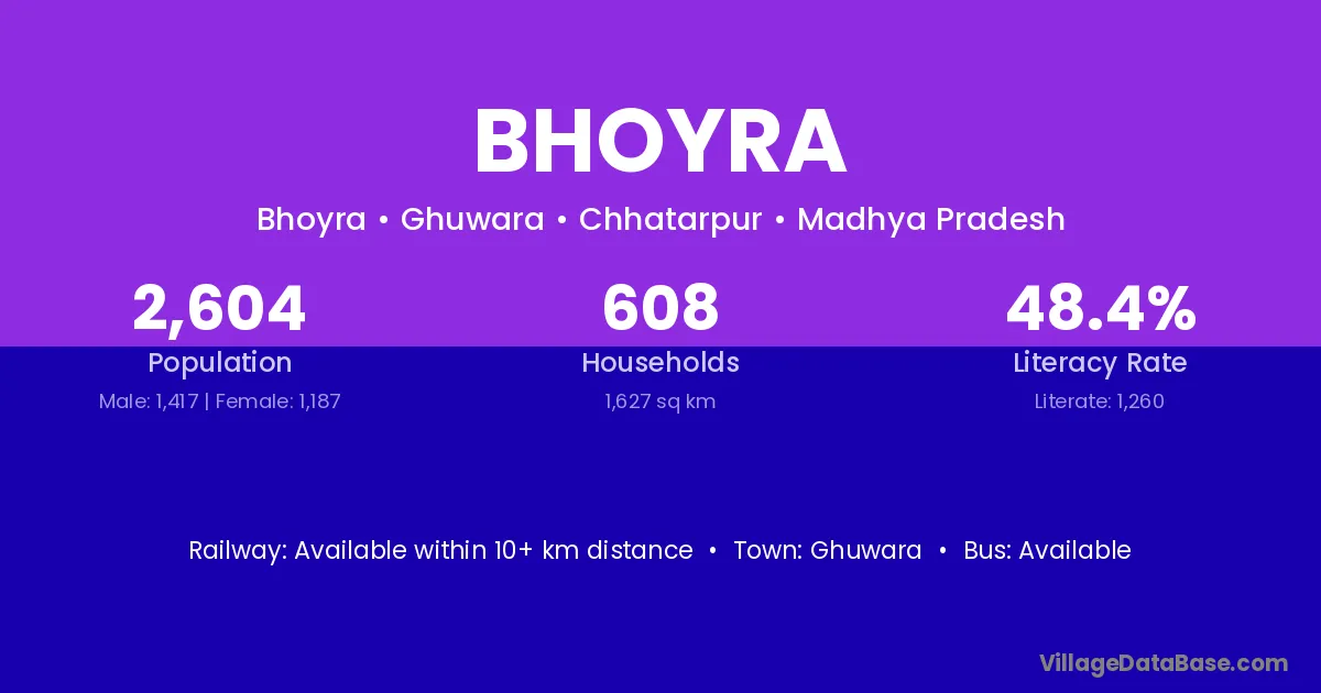 Bhoyra village has a total population of 2,604 people, of which 1,417 are males and 1,187 are females.