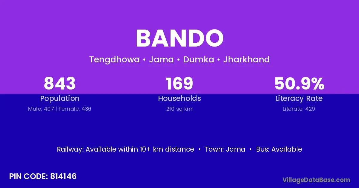 The literacy rate of Bando village is 39.20%. Male literacy stands at 50.00% and female literacy at 24.53%.