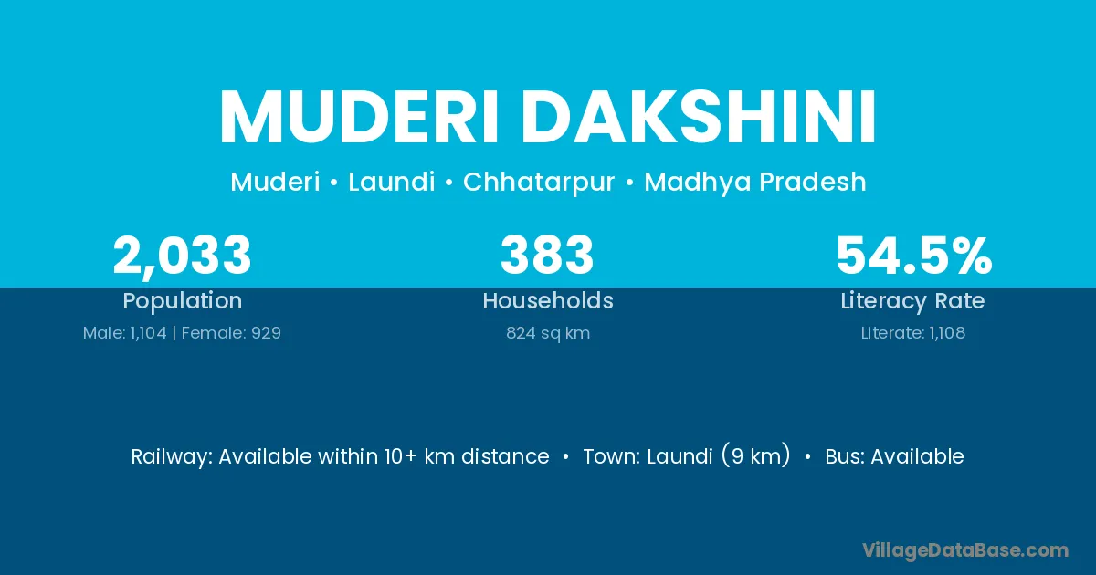 Muderi Dakshini village has a total population of 2,033 people, of which 1,104 are males and 929 are females.