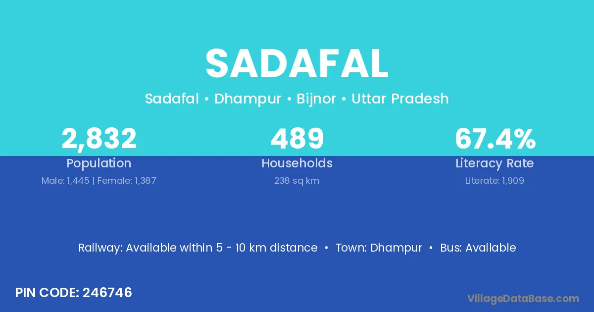 The literacy rate of Sadafal village is 54.38%. Male literacy stands at 61.90% and female literacy at 46.05%.