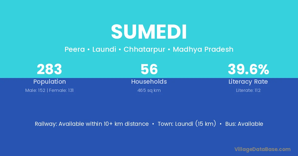 Laundi (15 km) is the nearest town to Sumedi village for major economic activities and is located approximately 15 km away.