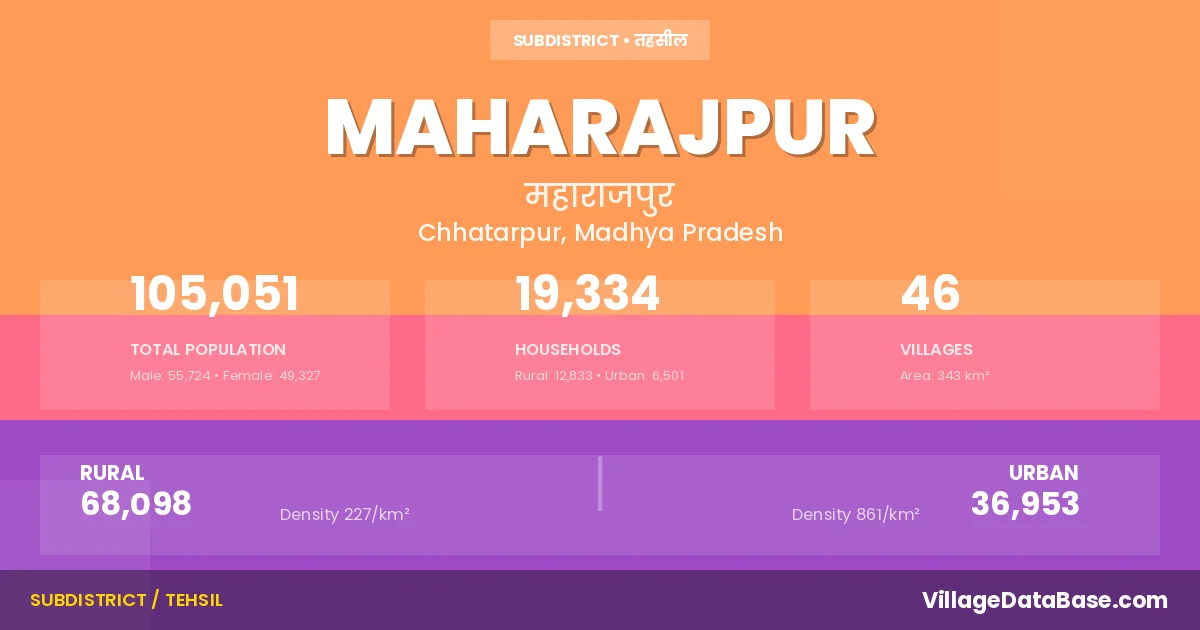 According to the 2011 census The total area of Maharajpur Tehsil is 343 km², with a population of 105051 people. The population density is 306 inhabitants per square kilometre, and there are approximately 19334 houses in the sub district.