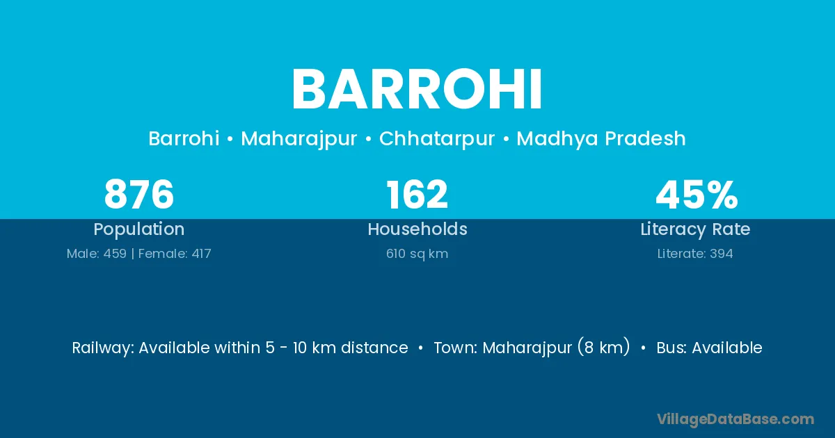 Maharajpur (8 km) is the nearest town to Barrohi village for major economic activities and is located approximately 8 km away.