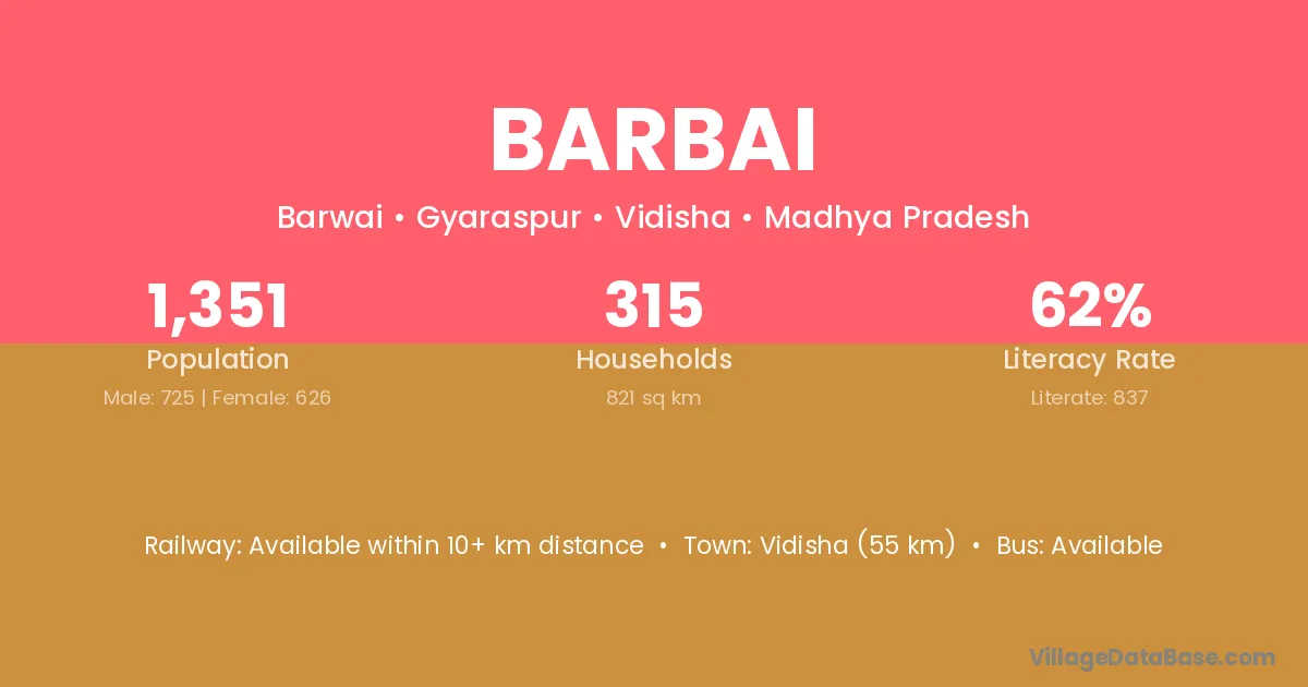 The literacy rate of Barbai village is 68.21%. Male literacy stands at 77.92% and female literacy at 58.11%.