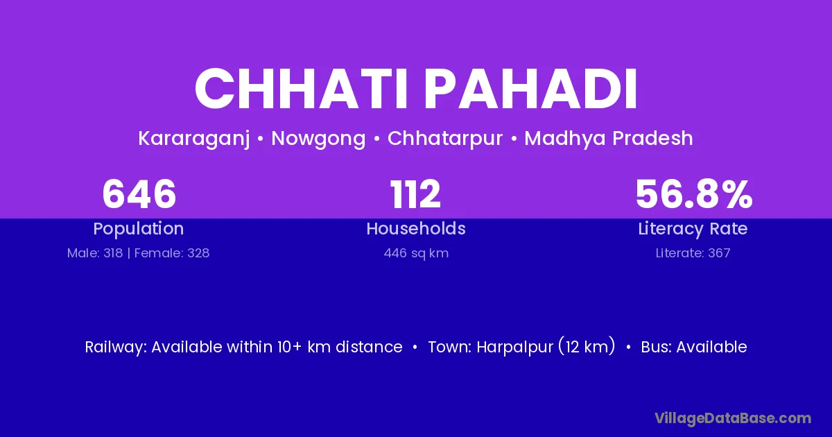 Chhati Pahadi village has a total population of 646 people, of which 318 are males and 328 are females.