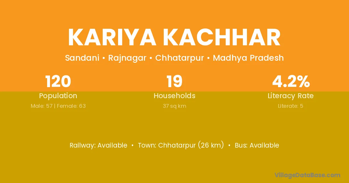 Chhatarpur (26 km) is the nearest town to Kariya Kachhar village for major economic activities and is located approximately 26 km away.