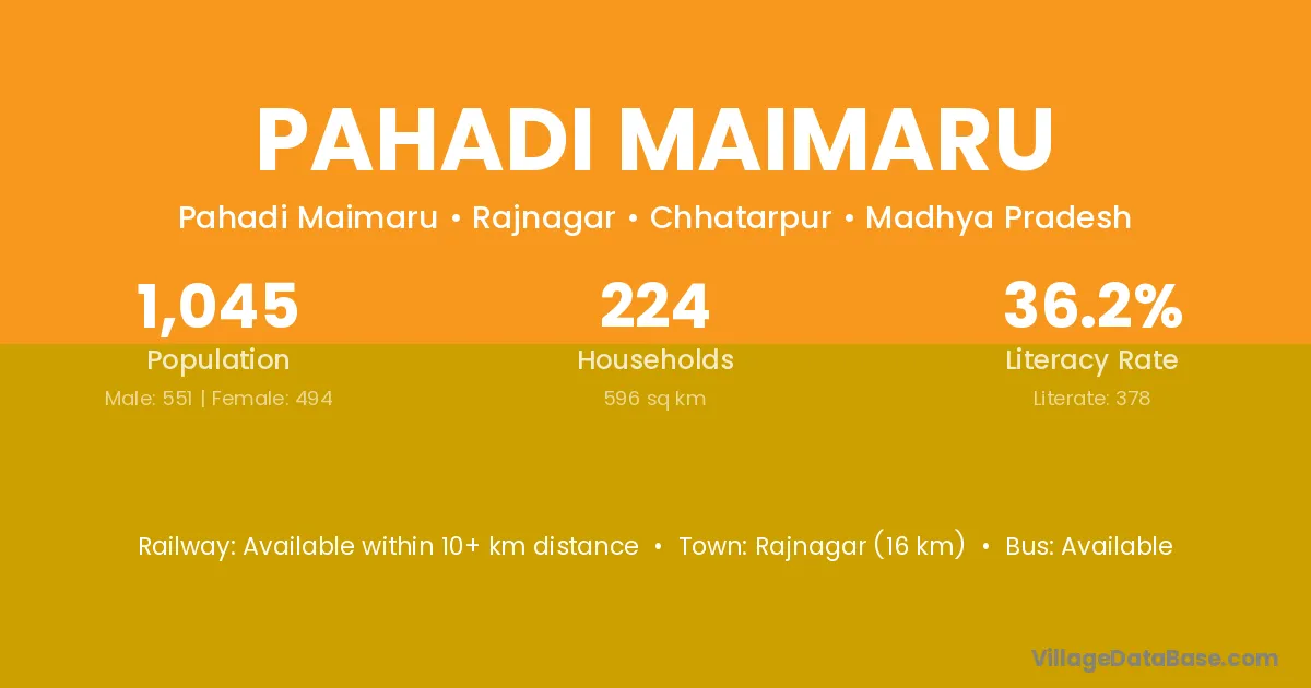Rajnagar (16 km) is the nearest town to Pahadi Maimaru village for major economic activities and is located approximately 16 km away.