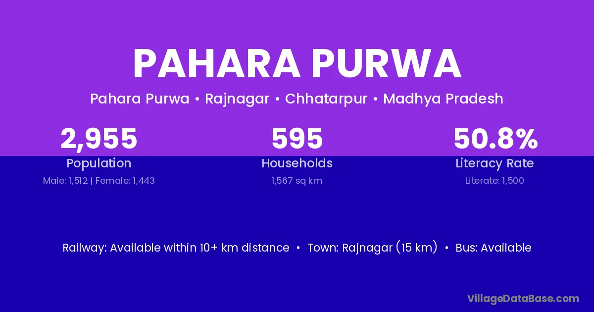 Rajnagar (15 km) is the nearest town to Pahara Purwa village for major economic activities and is located approximately 15 km away.