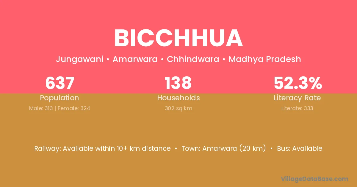 Amarwara (20 km) is the nearest town to Bicchhua village for major economic activities and is located approximately 20 km away.