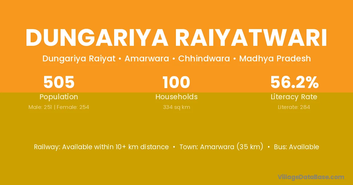 Amarwara (35 km) is the nearest town to Dungariya Raiyatwari village for major economic activities and is located approximately 35 km away.