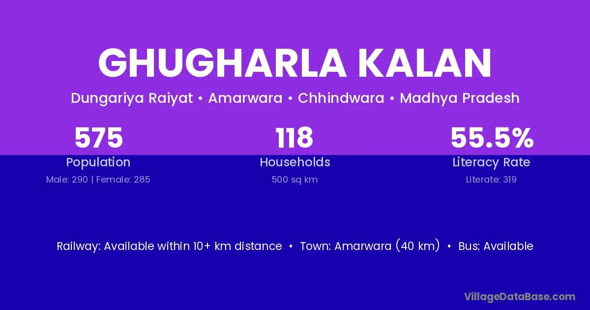 Amarwara (40 km) is the nearest town to Ghugharla Kalan village for major economic activities and is located approximately 40 km away.