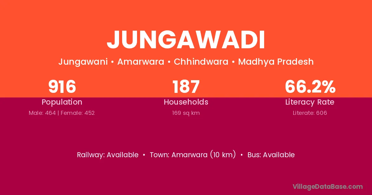 Jungawadi village has a total population of 916 people, of which 464 are males and 452 are females.